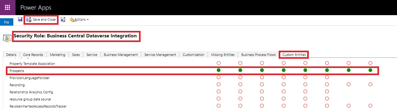 Select Custom Entities tab and find your table Prospects. Select each circle 4 times to assign Organization, circle should turn completely filled green color.