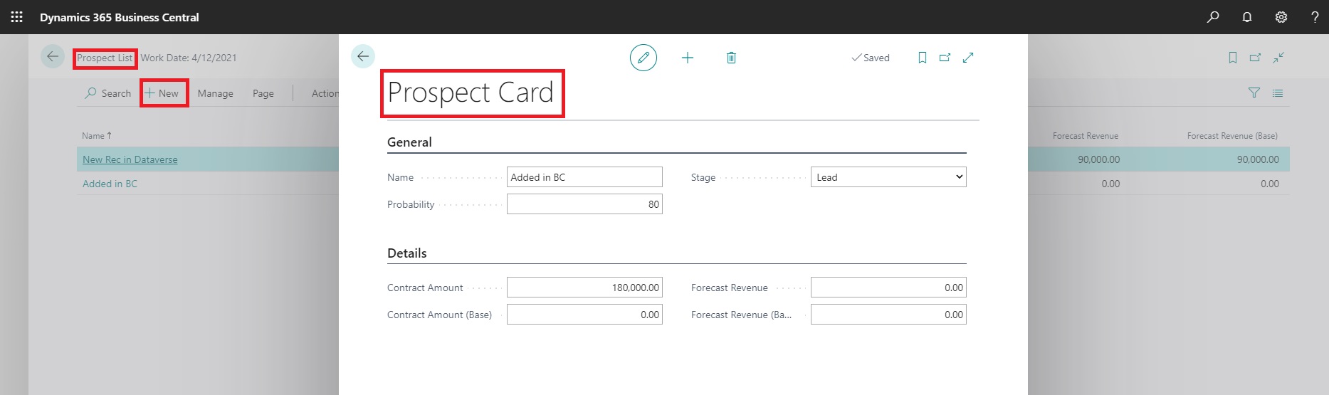 Now Let us Add one Record in Business Central, from Prospect Page.