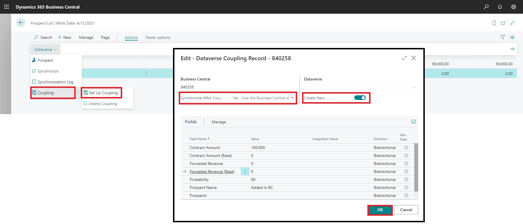 Select the record we just added in BC. Action-> Dataverse-> Coupling-> Setup Coupling